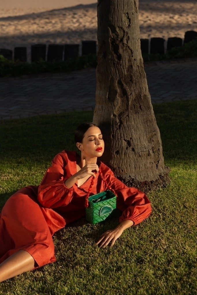 Com palha de carnaúba verde e alça de pedra sabão coral, a mini paba com ágata verde é uma peça autoral,